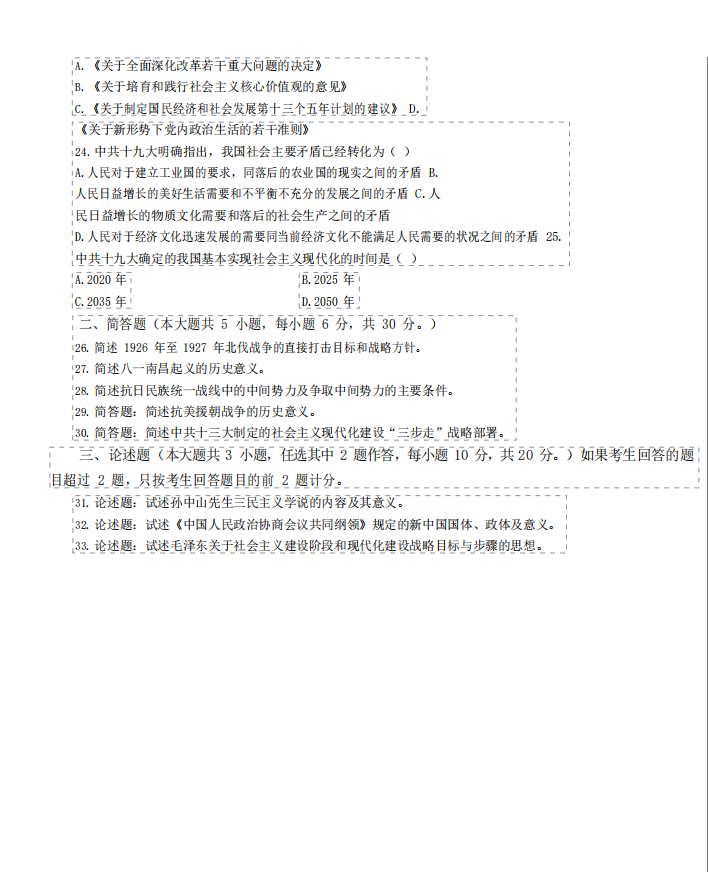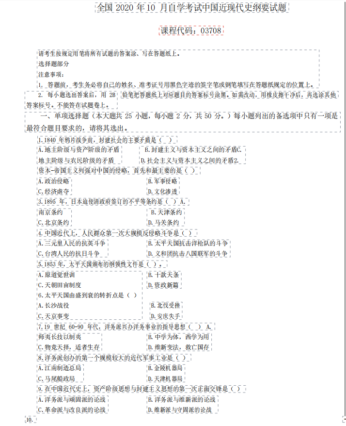 2020年10月山东自学考试中国近现代史纲要题及参考答案
