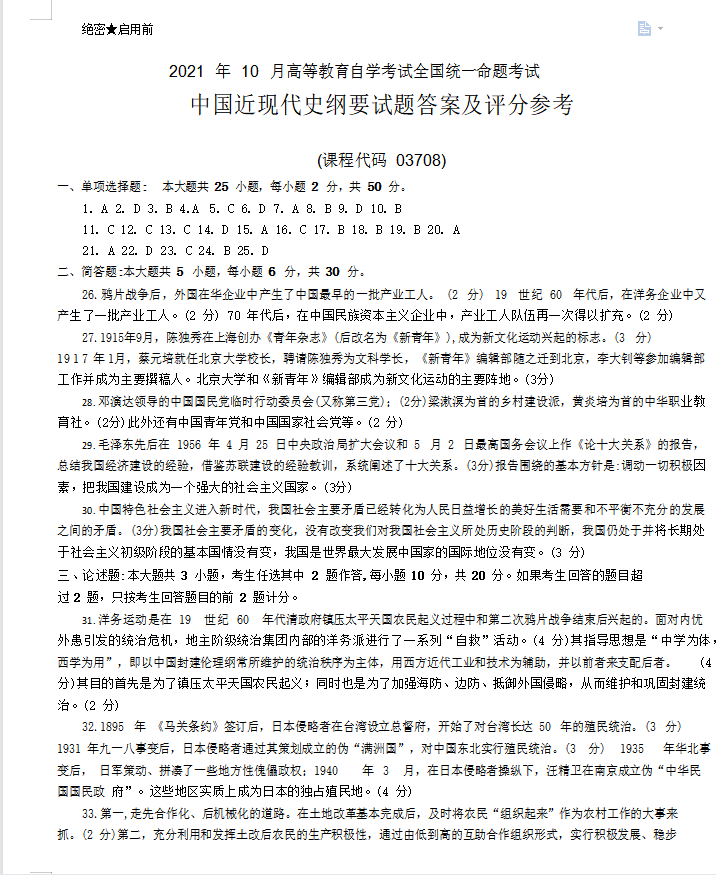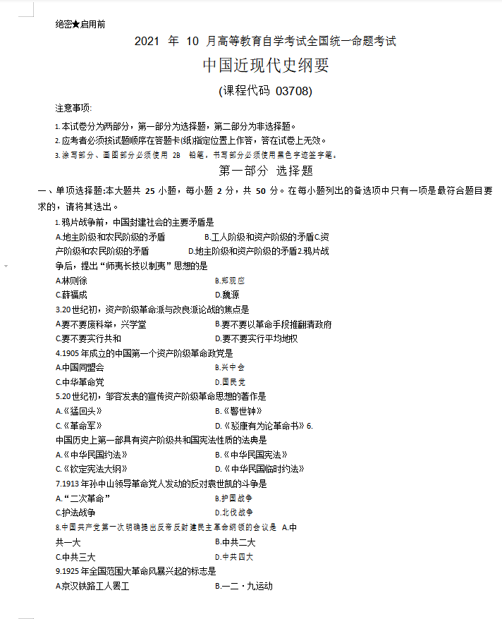 2021年10月山东自学考试本科中国近现代史纲要历年真题